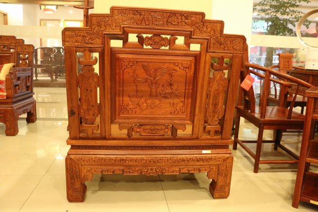 沙發(fā)正上方為一條橫架著的左右兩邊呈三截"樓梯"式樣的長(zhǎng)板,長(zhǎng)板的正面和背面都刻畫了許多喻示著吉祥平安福到之意的法器寶物,譬如道家八寶中的:鐵拐李的寶葫蘆、曹國(guó)舅的玉板、何仙姑的荷花以及藍(lán)采和的花籃等。